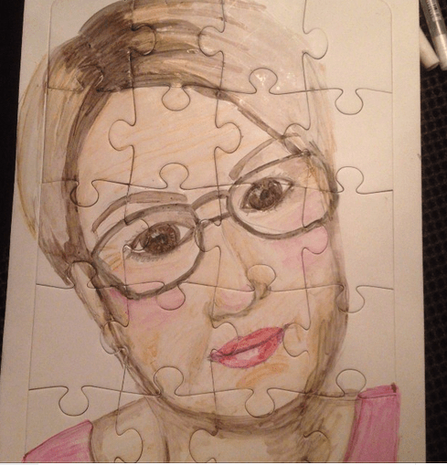 Jag började med att dra lite blyertsstreck av mej själv på ett pussel. Därefter har jag färglagt bilden. Det är så svårt att få fram åldern på en bild, rynkor eller livslinjer blir så konstiga…